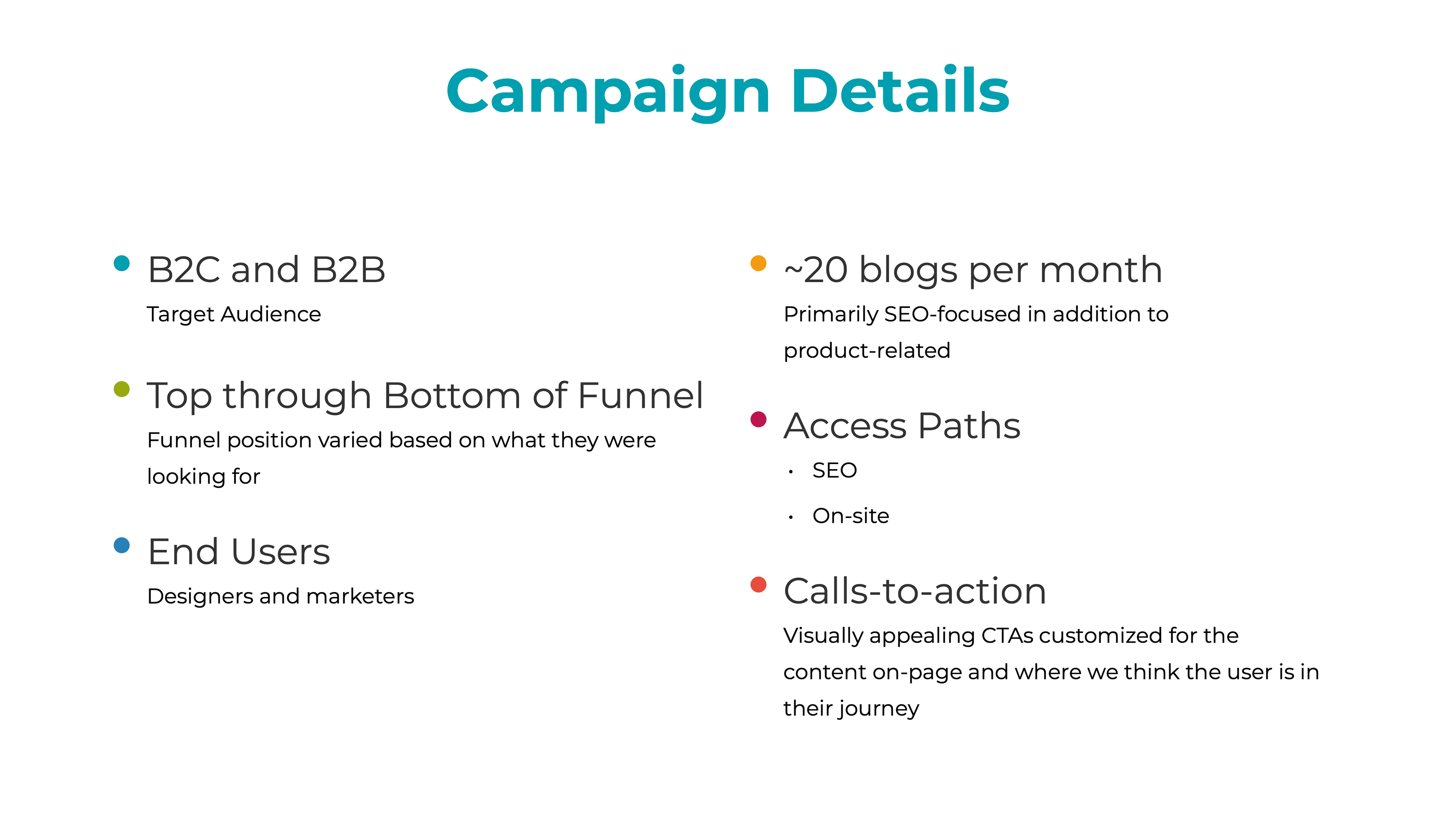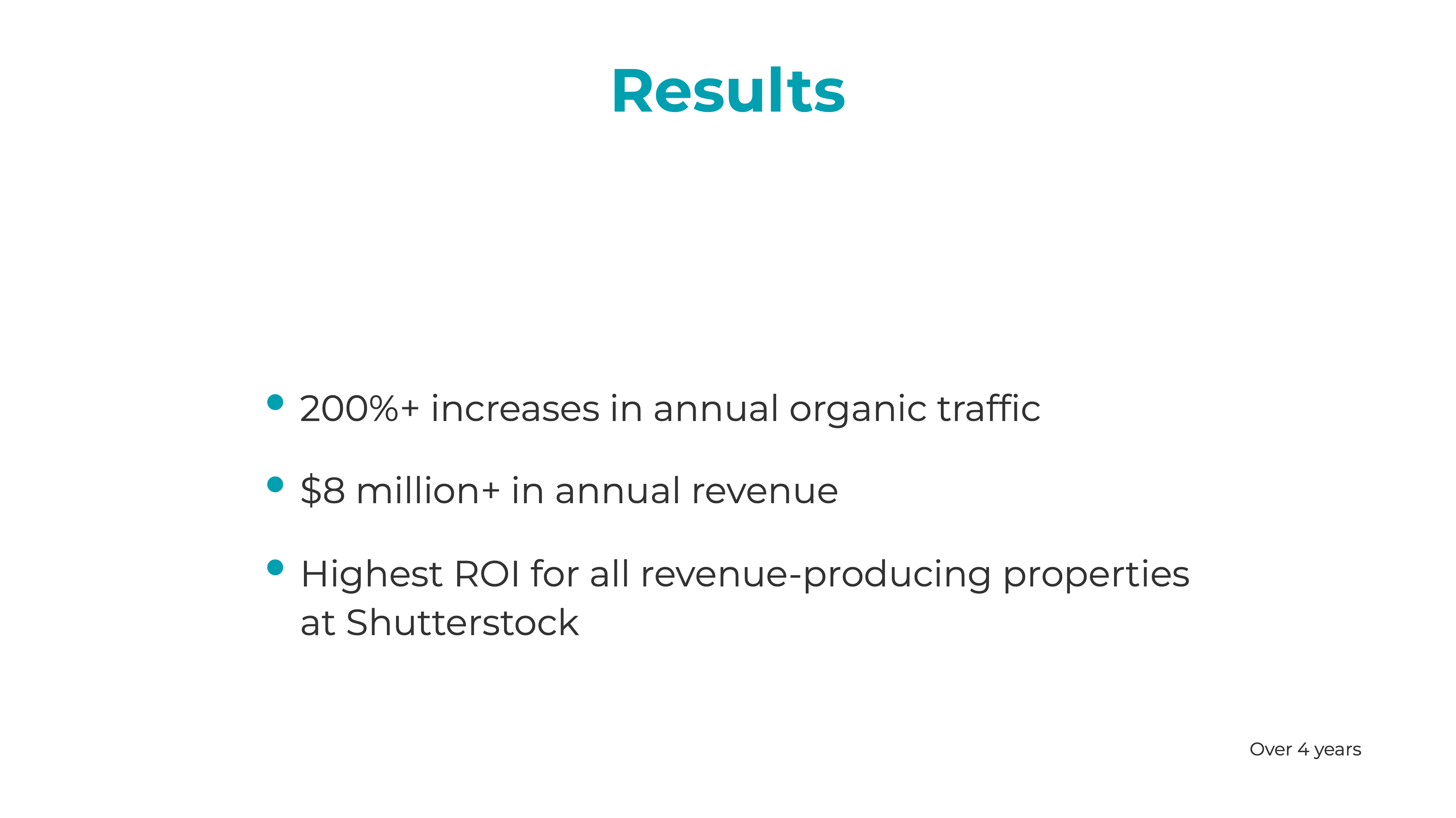 CAMPAIGN RECAP: I developed and executed the outlined plan to generate revenue via Shutterstock's knowledge base, generating over $24 million in B2B and B2C revenue during my 4-year tenure (includes only organic, directly-attributable revenue). This initiative was recognized as having the highest ROI at the company.