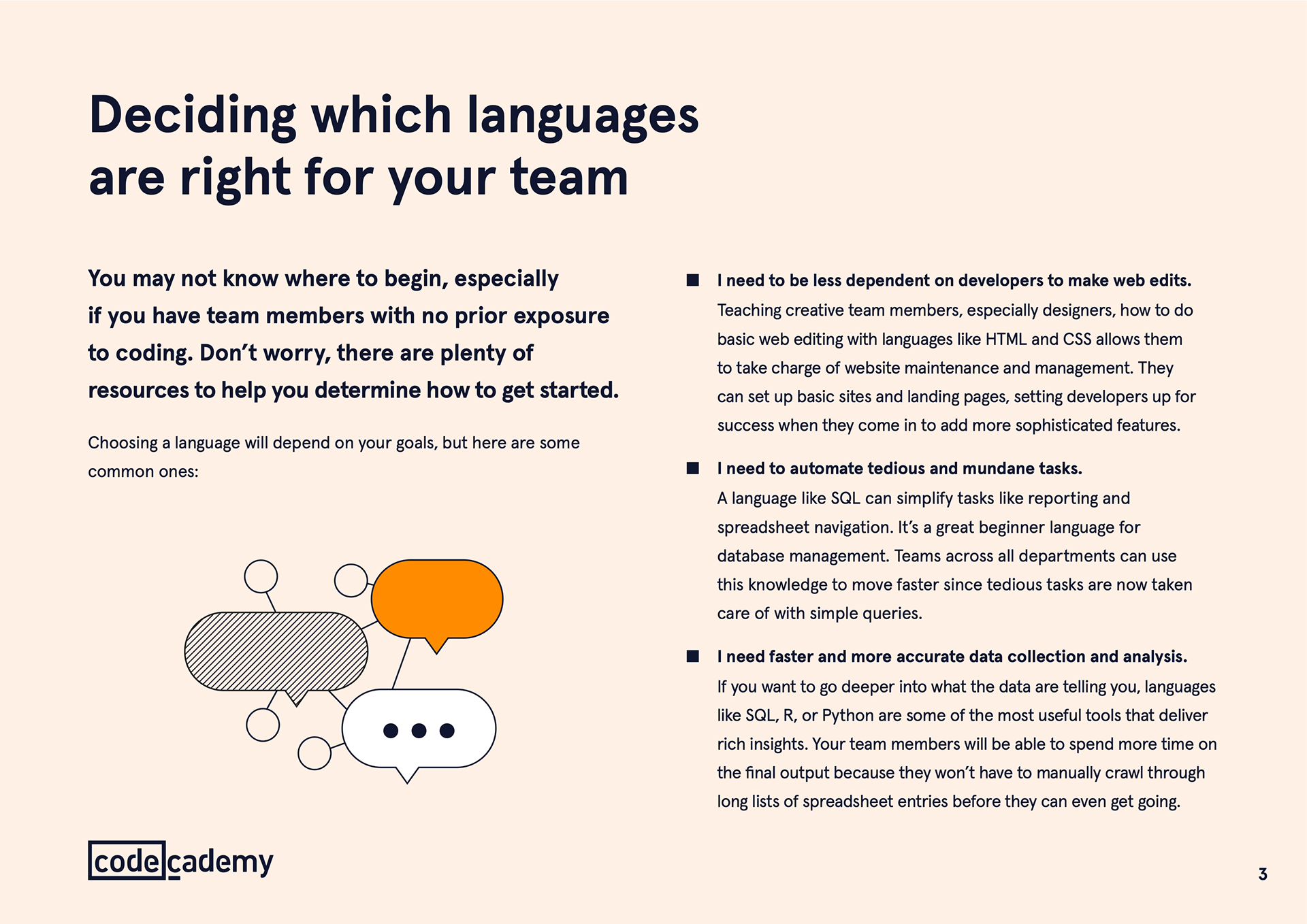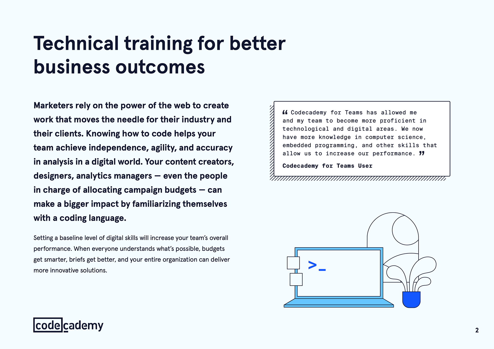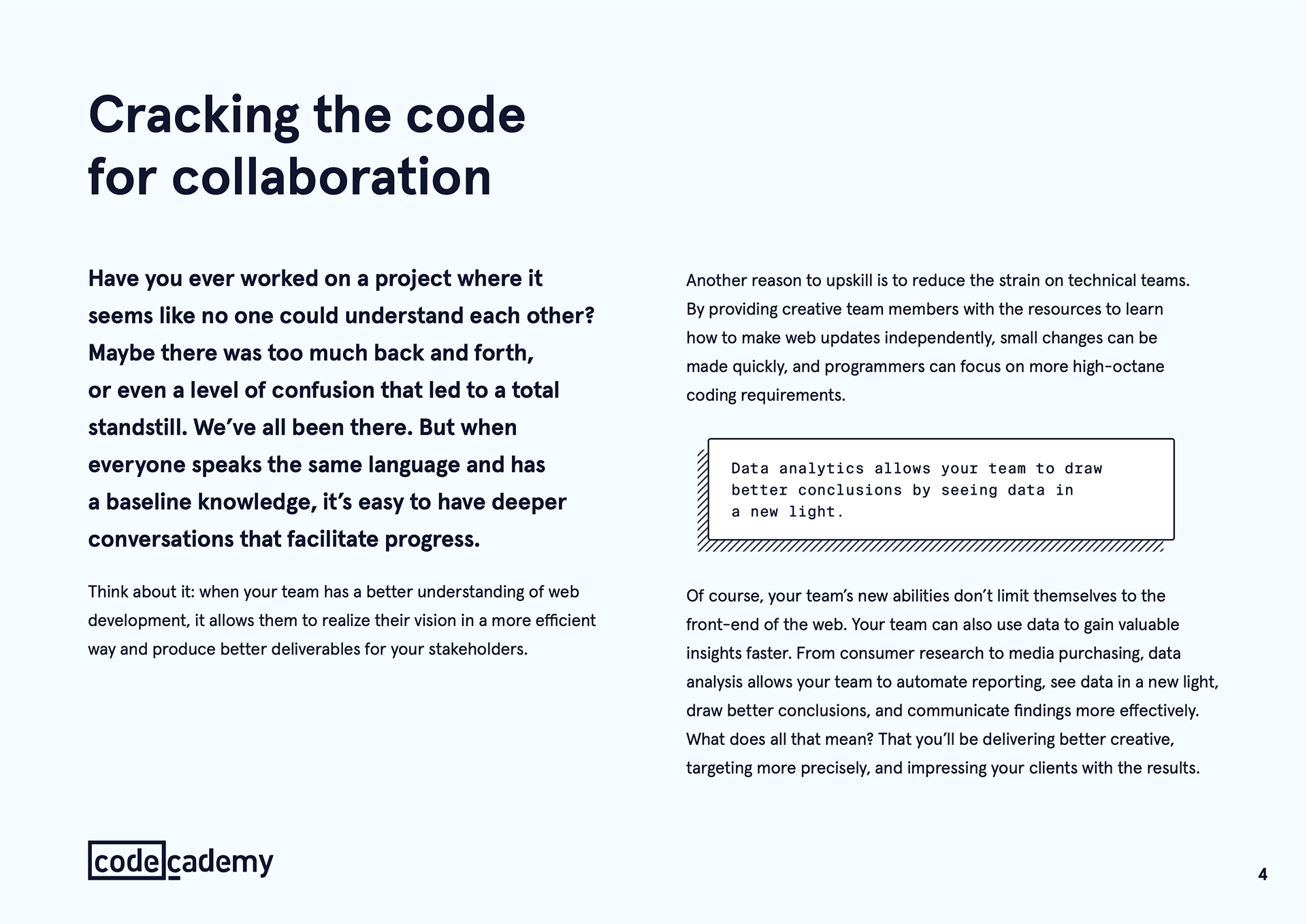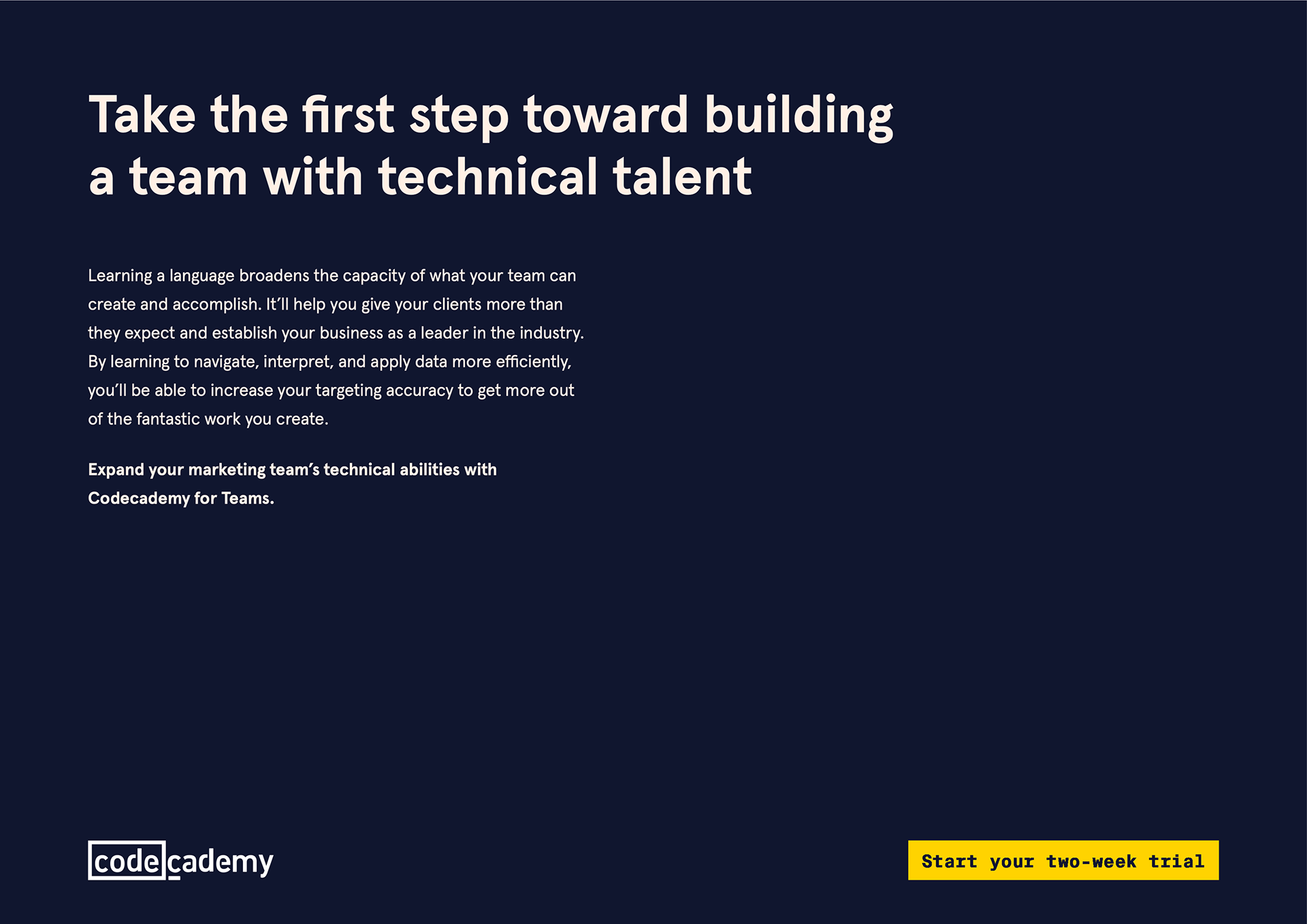 E-BOOK: I directed the narrative, copy, and design of this e-book, created to target one of Codecademy’s key personas: marketing managers looking to introduce more tech into their workflows. This was part of my initial launch of the company’s B2B product.