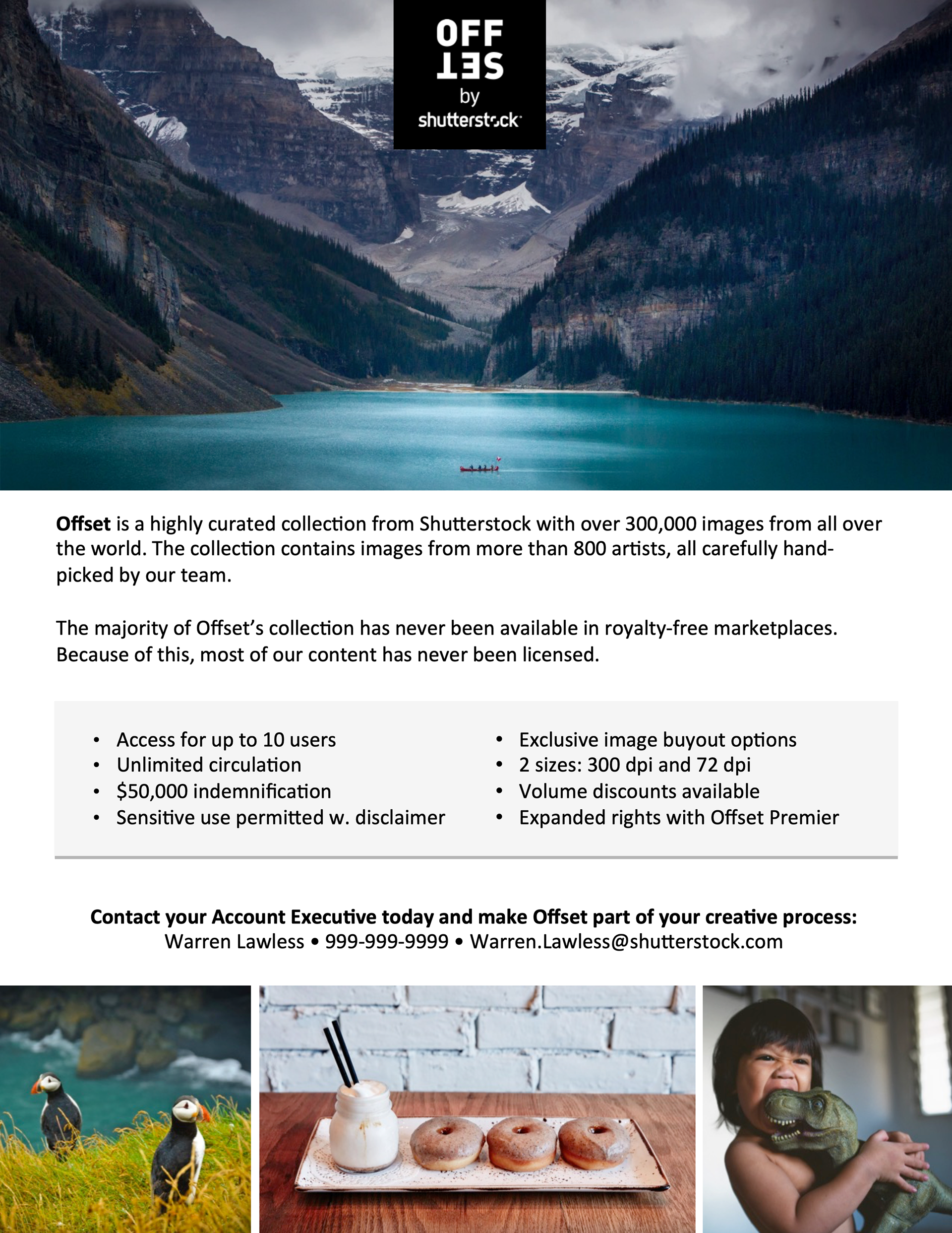 SALES ENABLEMENT: I developed this piece to aid the company’s sales team in promoting Shutterstock's high-end brand, Offset. It was distributed as a customizable PDF allowing the team to individualize it.